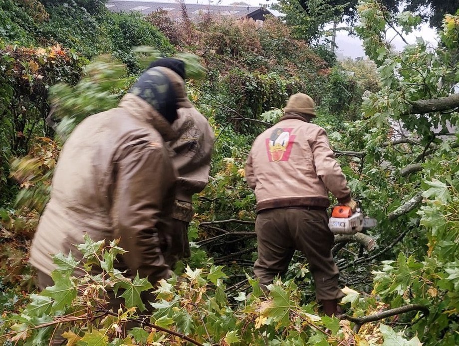 Alerte ! Lors de la dernière reconnaissance avec sa jeep ouvrant l'itinéraire, Didier nous signale un gros arbre tombé en travers la route. Les pompiers sont prévenus. Mais sans plus attendre, Marvin saisit une tronçonneuse et intervient avant l'arrivée des pompiers. La route est dégagée. Juste à temps car les premiers véhicules arrivent…
