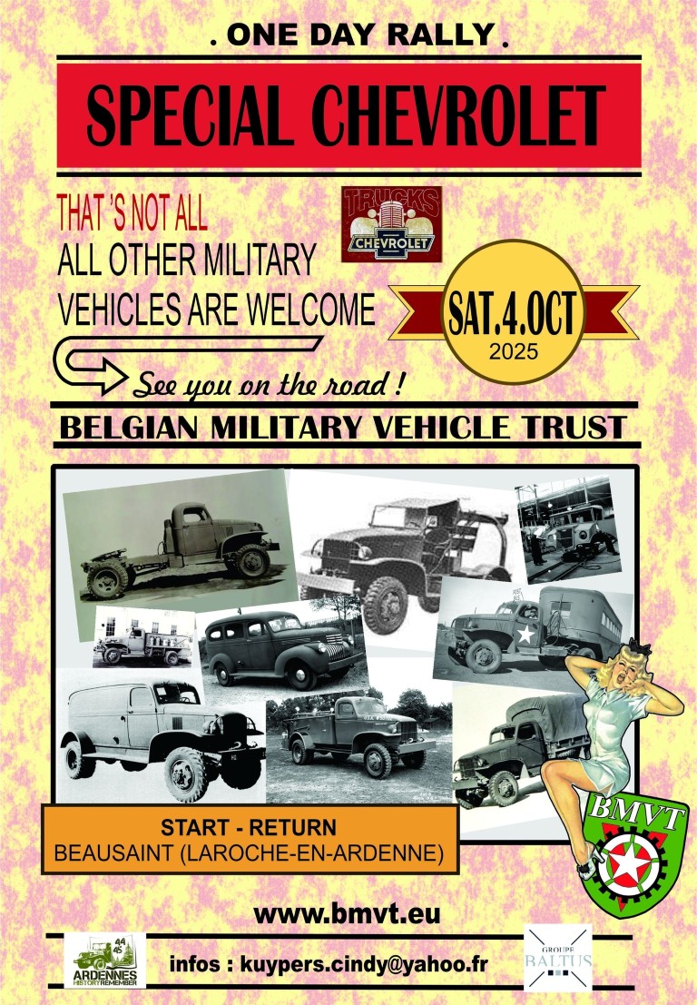 Le 4 octobre dernier, le Belgian Military Vehicle Trust organisait sa traditionnelle et classique sortie d’un jour, le One-Day Rally, un évènement réservé aux véhicules militaires alliés de la seconde guerre mondiale et à leurs constructeurs. Cette année, le thème choisi était dédié au constructeur Chevrolet, fournisseur – entre autres – d'un camion 4x4 de la classe 1,5-ton de charge utile (en tout-terrain) pour l'armée américaine durant le dernier conflit mondial. Un véhicule militaire US qui est plutôt rare de nos jours. Il fut le précurseur d'un autre camion fabriqué en masse par la General Motors Corporation : le légendaire camion 6x6 GMC CCKW de 2,5-ton de charge utile qui évincera partiellement le Chevrolet.